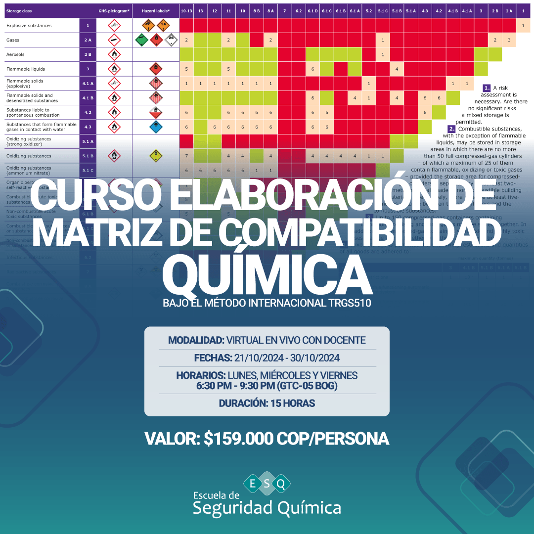 Este curso en modalidad virtual sincrónico está orientado a que en compañía permanente del docente, los participantes desarrollen los conocimientos y habilidades necesarias a fin de que éstos elaboren matrices de compatibilidad química para el almacenamiento seguro de productos químicos, aplicando el método internacional TRGS510 (almacenamiento de sustancias peligrosas en contenedores no estacionarios) y a identificar las condiciones de seguridad que deberá cumplir el almacenamiento de dichas sustancias. Para ello, se utilizarán como ejemplo 10 sustancias químicas de uso común en diferentes empresas.