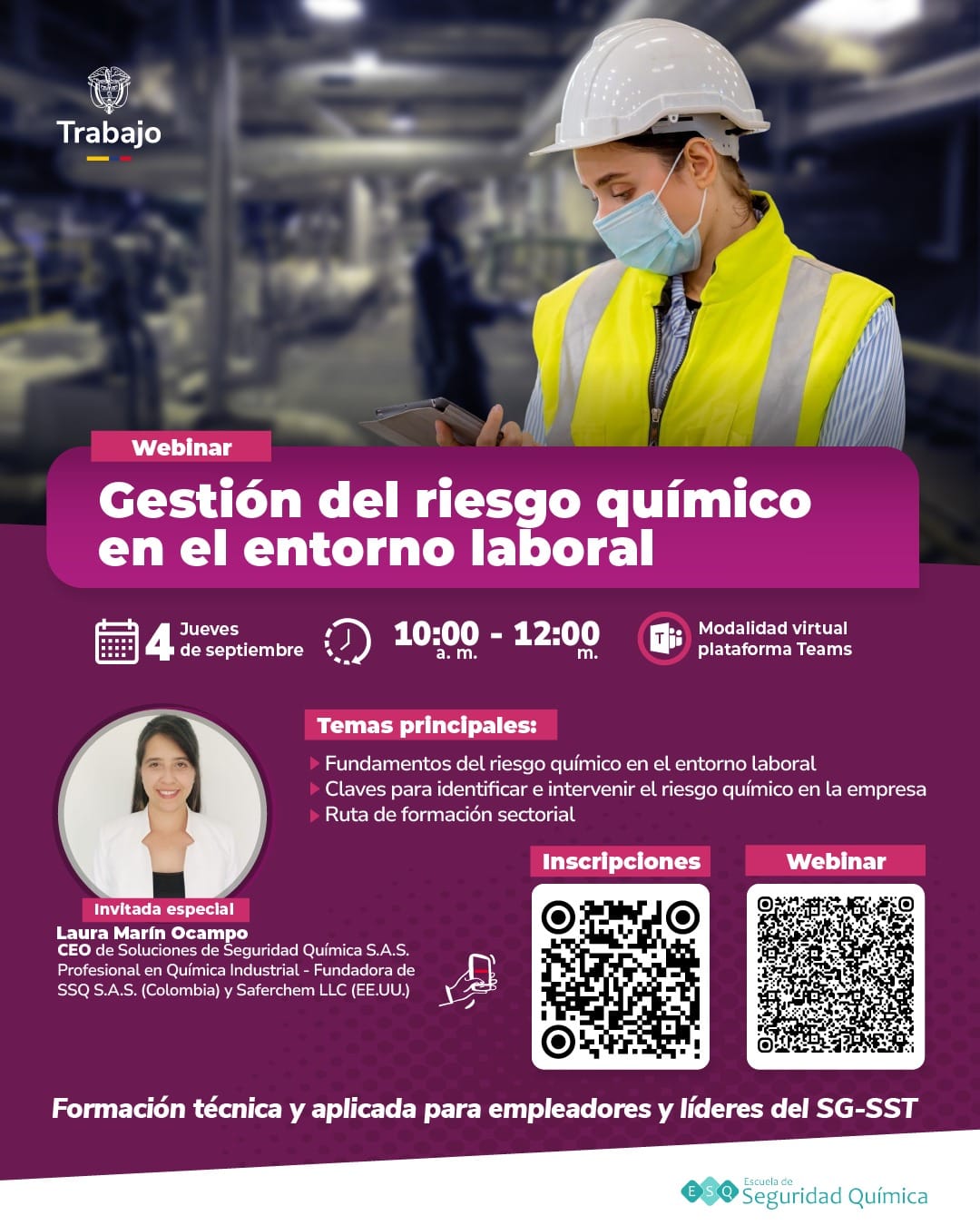 En alianza con la Dirección de Riesgos Laborales del Ministerio de Trabajo de Colombia, traemos para empresas de todos los sectores este webinar sobre Riesgo Químico: Fundamentos para la Acción